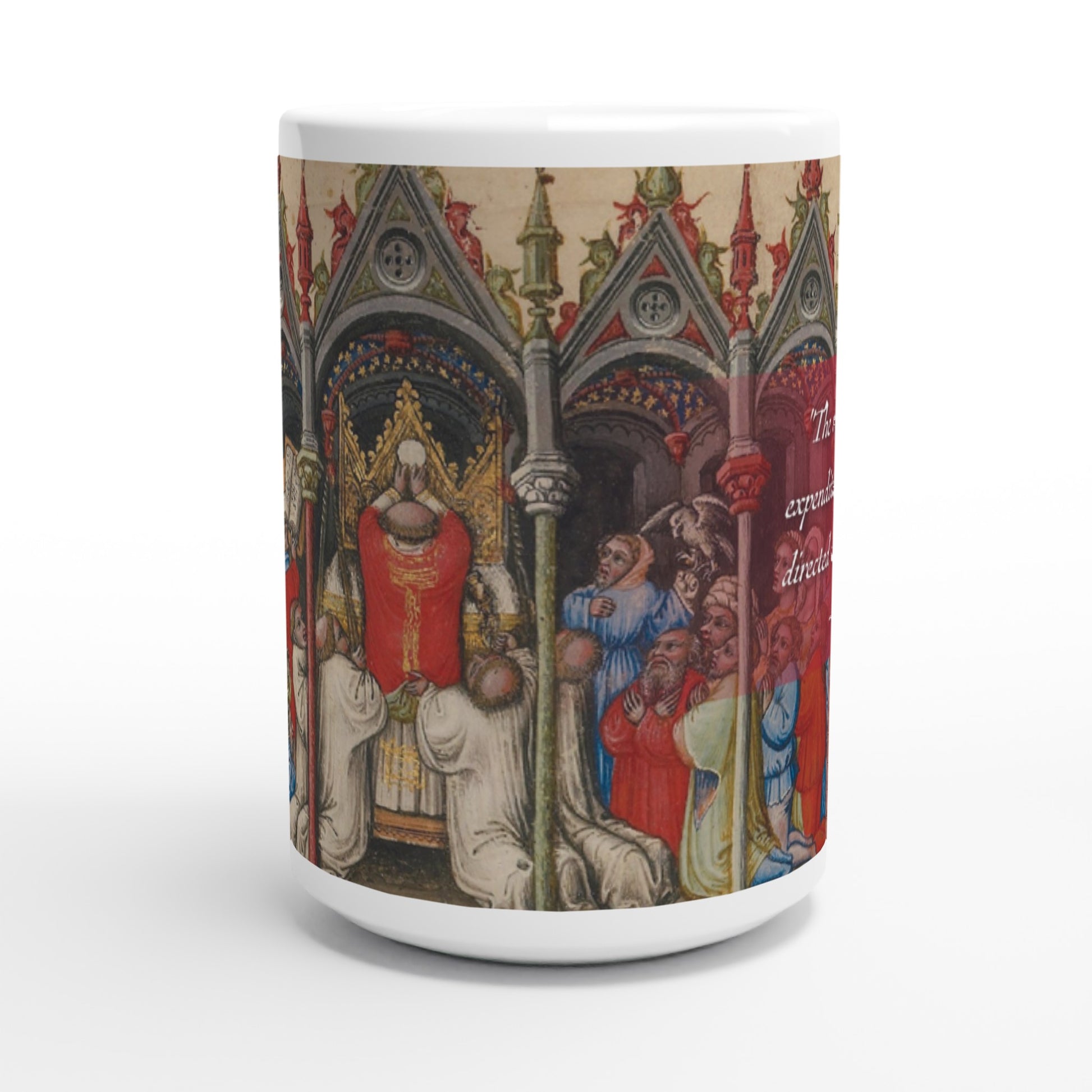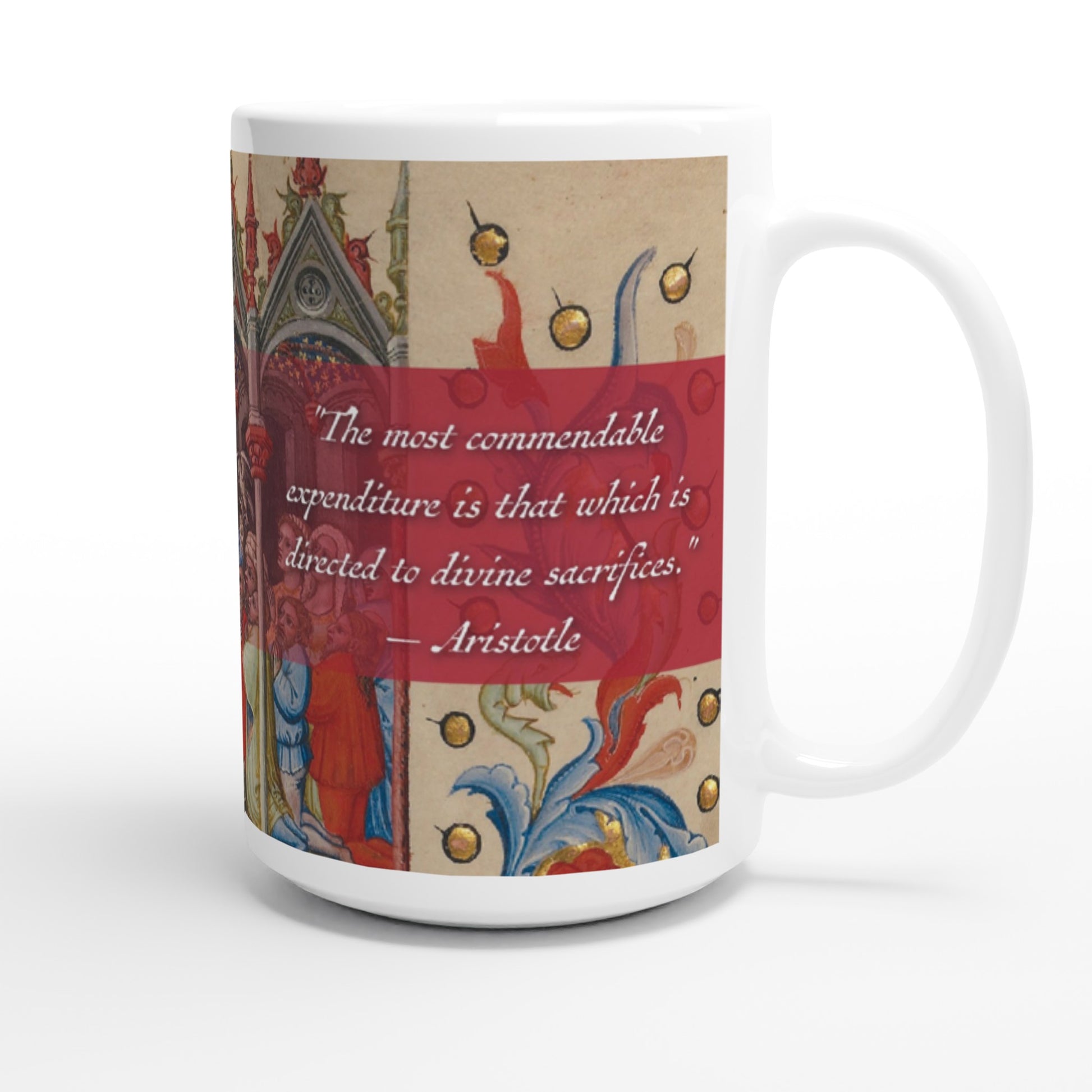 This mug connects the sentiment of Aristotle that "The most commendable expenditure is that which is directed to divine sacrifices" to the Catholic Mass, featuring an illumination from a 14th-century Italian manuscript.